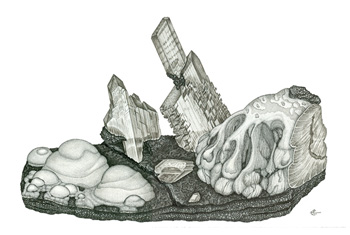 | Реликты кристаллов кальцита, замещённые и обросшие кварцем. // Calcite(dissolution forms) with Quartz. 6cm. Dalnegorsk. Indian ink on artboard. V. Slyotov & V. Makarenko | Пучёк обросших кораллитами кристалликтитов, вросший в сферолитовую кору кальцита. Образец 20 см. Хайдаркан, из карстовой пещеры. // Calcite Cave Formation. Khaidarkan, Kirgizia. Indian ink on artboard. V. Slyotov & V. Makarenko | |||